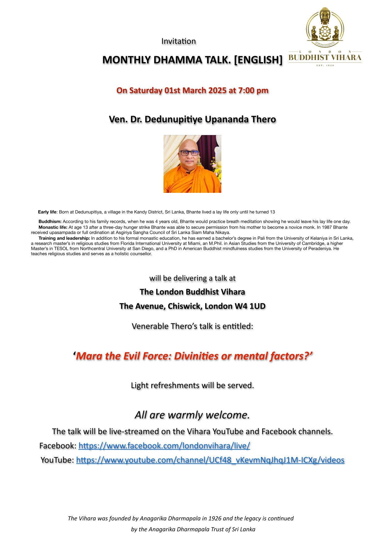 The said letter that you received has so much misinformation that it seems to be an attempt to damage the reputation of the LBV trustees.The claim that the present trustees have been removed, and new trustees have been appointed by ADT is false. You could easily check this on the Charity Commission website under London Buddhist Vihara Trust (Charity No 1192854). It will show that the present trustees named below are still there. The Charity Commission does not follow instructions from third parties and there is a procedure to follow in these matters even for Authorised people. This is just one example of the misinformation contained in the letter to mislead the supporters. Not what is expected of an organisation which is expected to support the Mission of Anagarika Dharmapala.