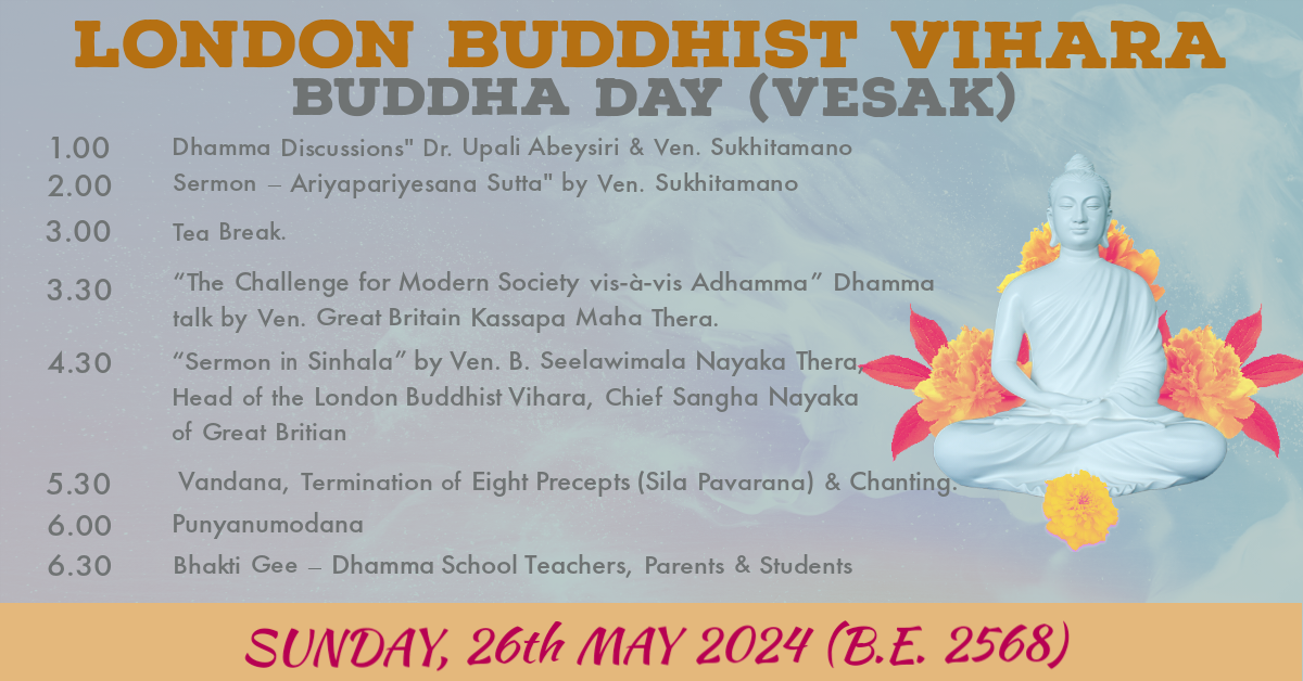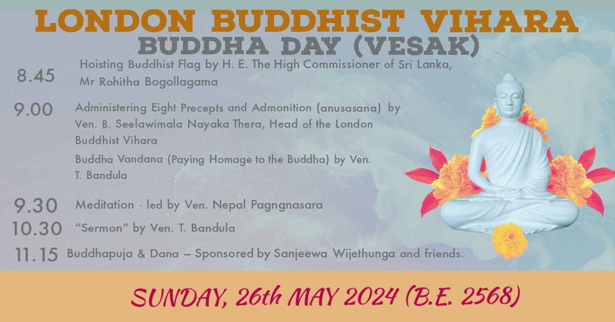This year's Vesak celebrations were held at the London Buddhist Vihara on Sunday, 26 May 2024.